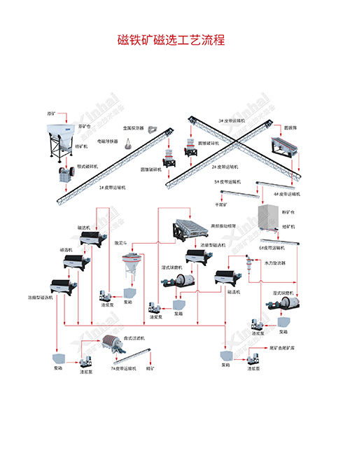 【工藝介紹】:磁鐵礦選礦方法在鐵礦石選別方面處于主導地位,鑫海針對弱磁性貧鐵礦采用重選、磁選、浮選和焙燒磁選,以及聯合流程等方法處理;針對強磁性鐵礦直接采用磁 選法處理。